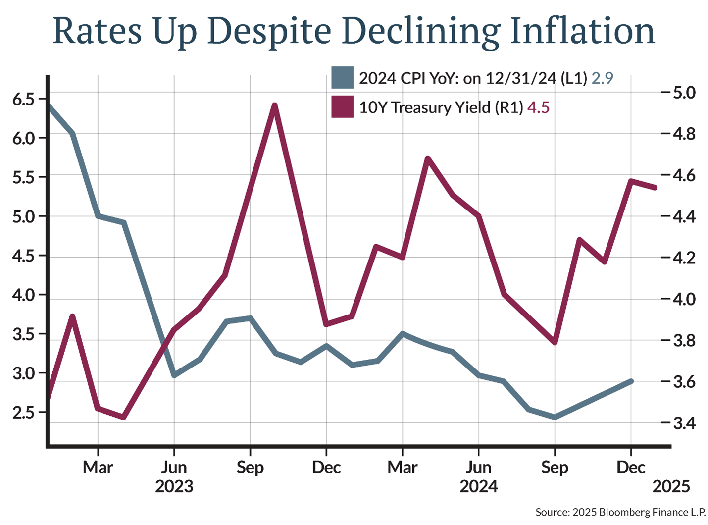 The about face in yields and investor sentiment can be attributed to higher-than-expected inflation readings last fall and uncertainty over how the new administration’s policies will affect growth and inflation. At its December meeting, Fed officials said they expect prices to rise by 2.5% next year, up from 2.1% just a few months prior. Minutes of the meeting showed that Fed officials believe “upside risks to the inflation outlook had increased,” partly due to policy changes including proposed curbs on immigration, tax cuts, and tariffs.
