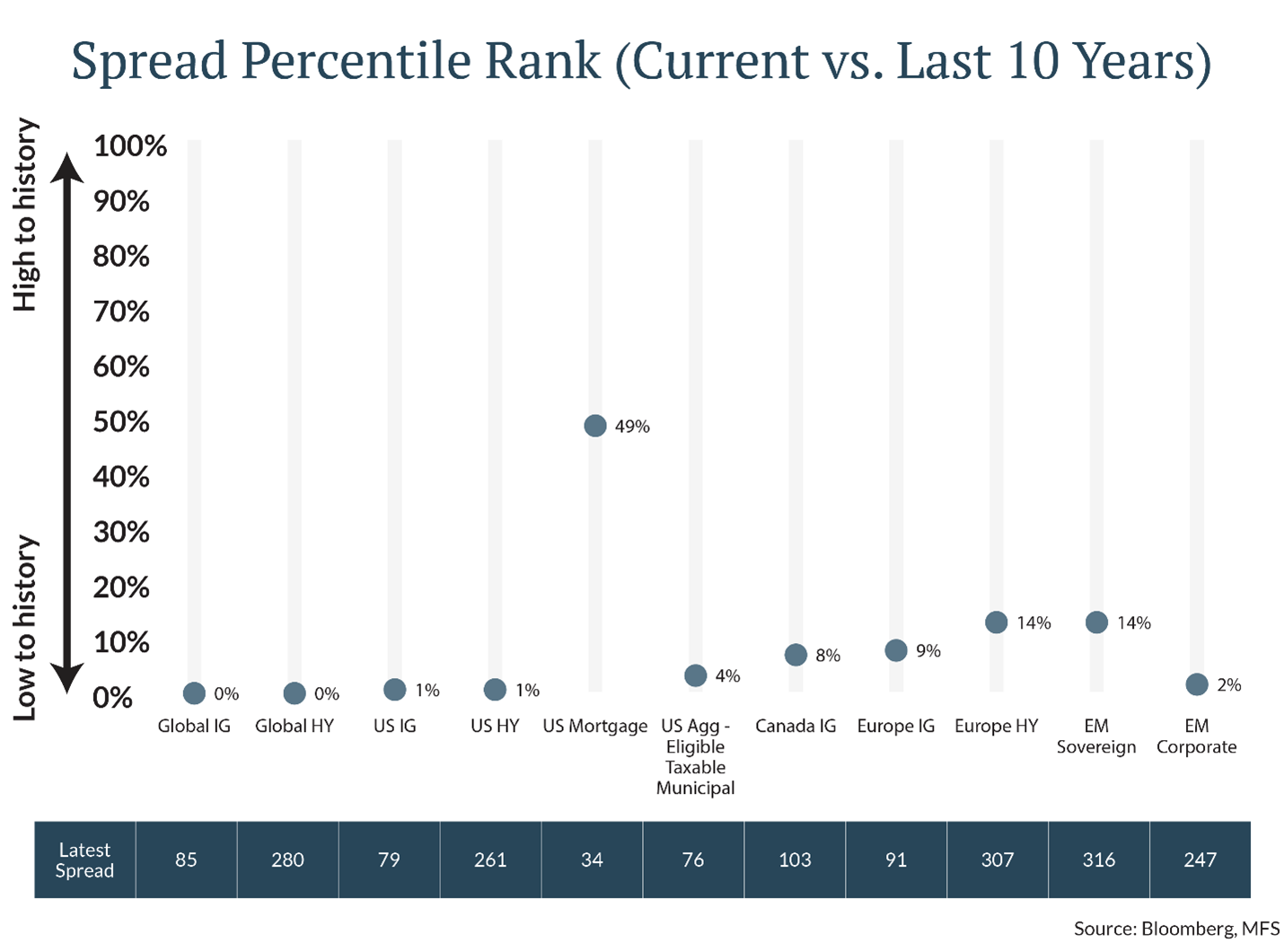 While we are excited about the prospects for long-term returns between 4%-5% on high quality bonds, we remain cautious on credit due to rich valuations. Credit spreads reflect the extra compensation above Treasuries that investors demand to own bonds subject to the credit risk of the issuer. The chart below [Figure 2] shows how most credit sectors offer poor compensation compared to history. Both investment grade (IG) and high yield (HY) corporate bond spreads are in the richest 1% vs. the last 10 years.