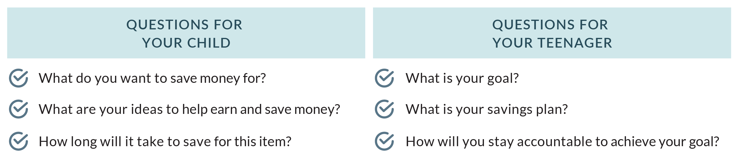 We start by asking our kids a few questions about what they’d like to save for and – most importantly – how they will plan for it. Here are a few conversation starters to consider for kids and teens alike: