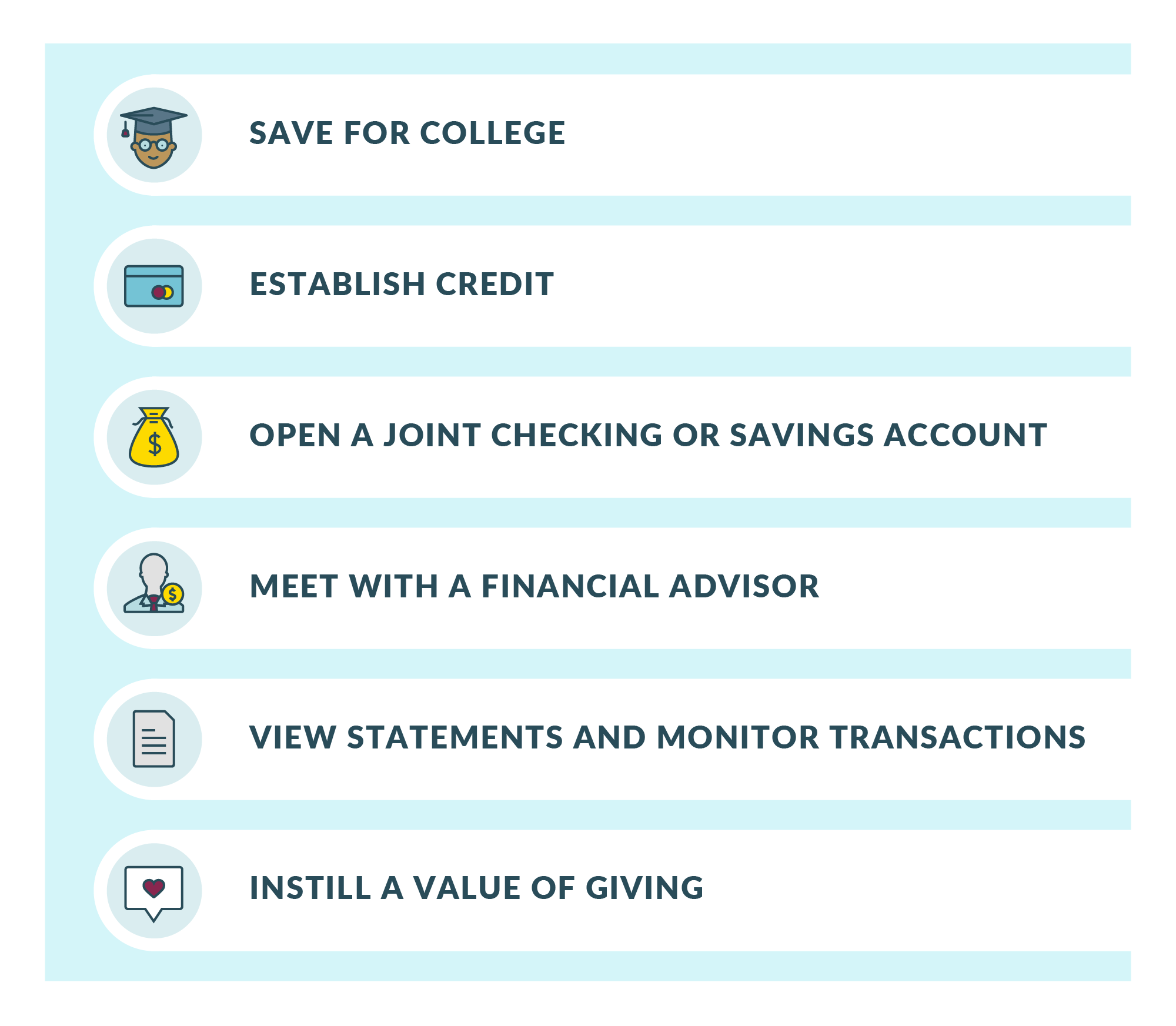At a young age, your child may have accompanied you to the bank to meet the bankers or count the coins from their piggy bank. As a teenager, encourage them to take ownership of their banking relationship and to speak with a Relationship Banker who can help them understand the accounts they will open and tools they can use to manage their finances.